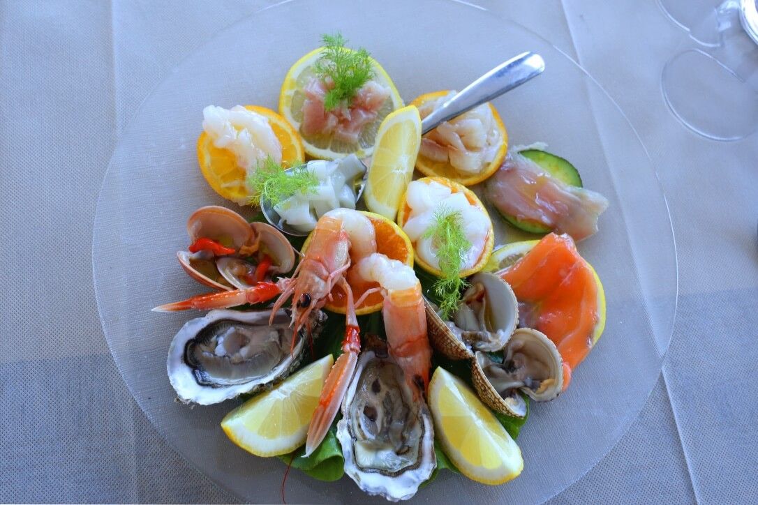 “Tutti misti di pesce” Gambero Marinato, Insalata di Mare, Filetto di Salmone, Alici Marinate e altro, secondo pescato. Calamaro ripieno, Seppie e peperoni, Polpettina di Baccalà, Gratinati, Scampo Lesso e Soutè di Cozze e Vongole. |