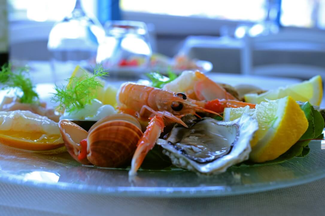 (Insalata di Mare, Gambero Marinato, Filetto di Salmone, Alici Marinate e altro secondo pescato.)