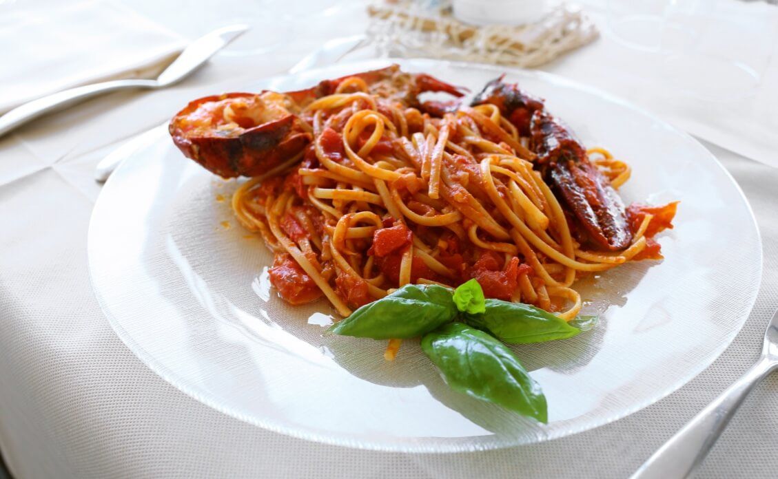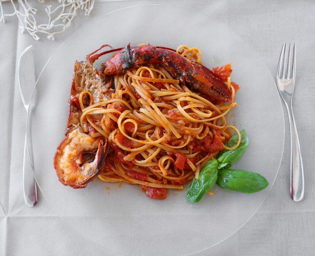 Mugnaia all’Astice Pasta artigianale prodotta ad Elice, dalla forma simile ad una tagliatella schiacciata al sugo rosso con 1/2 astice |