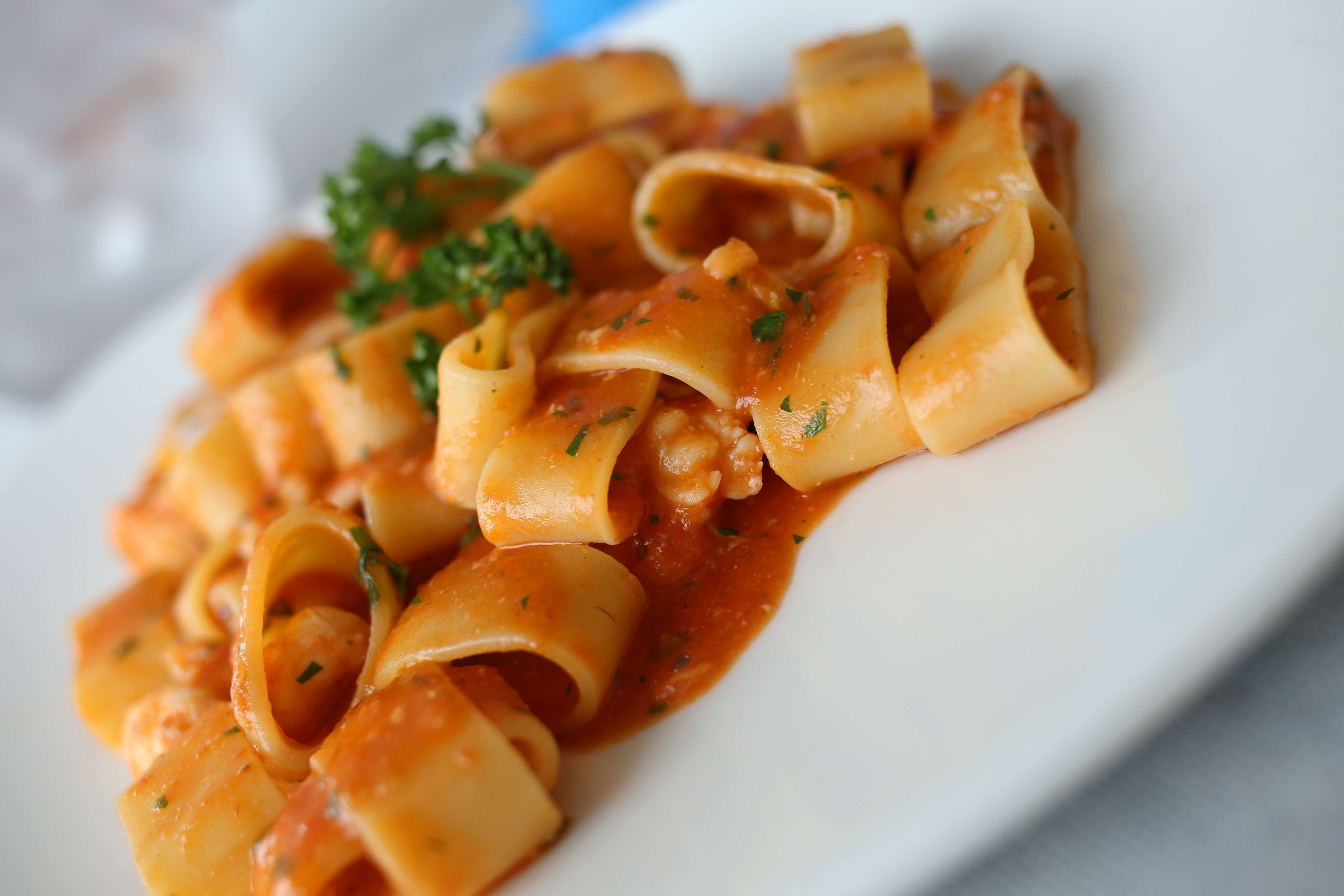 Mugnaia Pipè Pasta artigianale prodotta ad Elice, dalla forma simile ad una tagliatella schiacciata condita con sugo rosso a base di crostacei, molluschi ed altre varietà di pesce, secondo pescato |